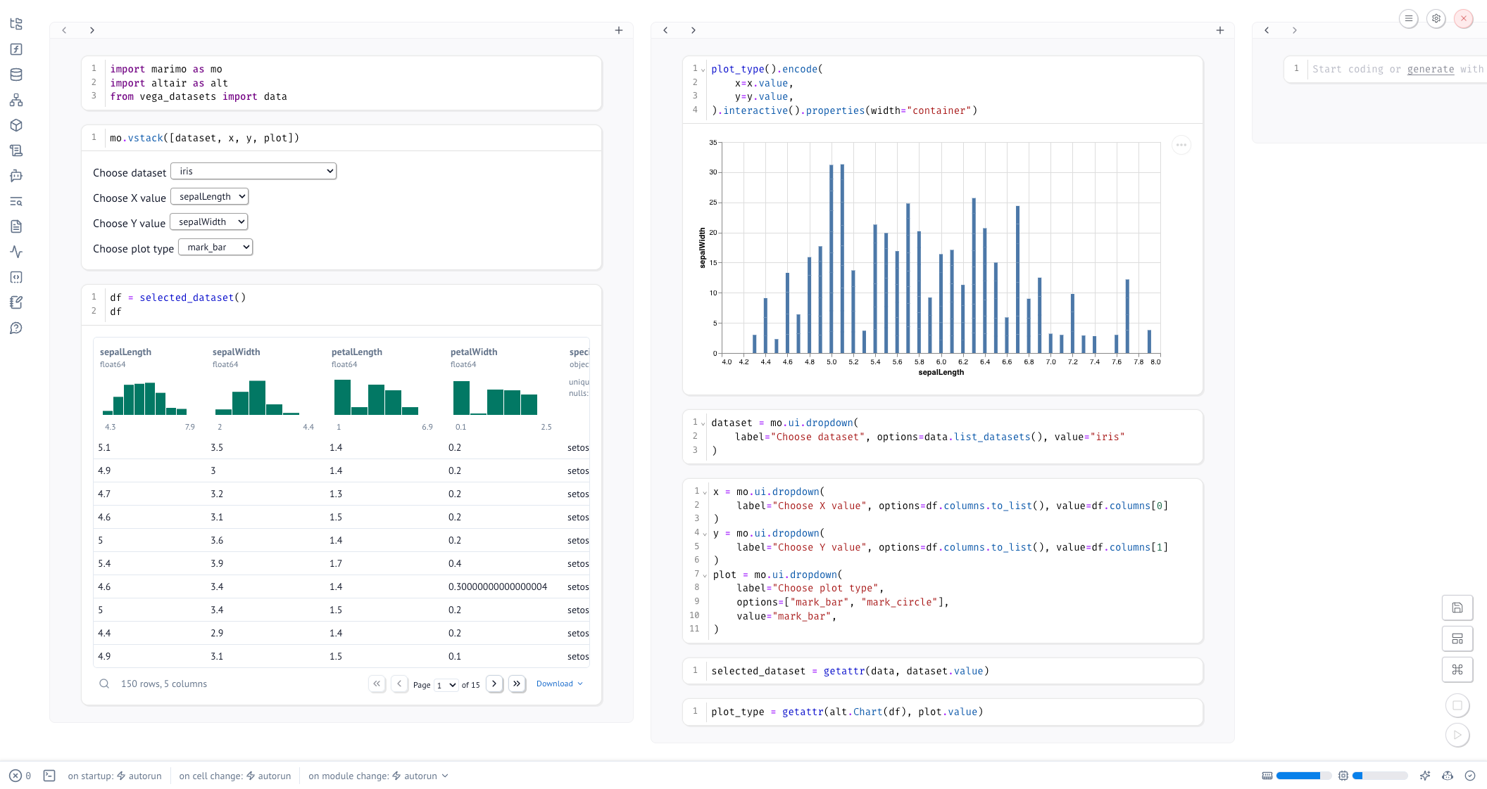- Multi-column: Splits your notebook into multiple columns, letting you view and edit cells side-by-side. This is only possible because marimo models your notebook as a directed acyclic graph (DAG) and the execution order is determined by the relationships between cells and their variables, not by the order of cells on the page.
